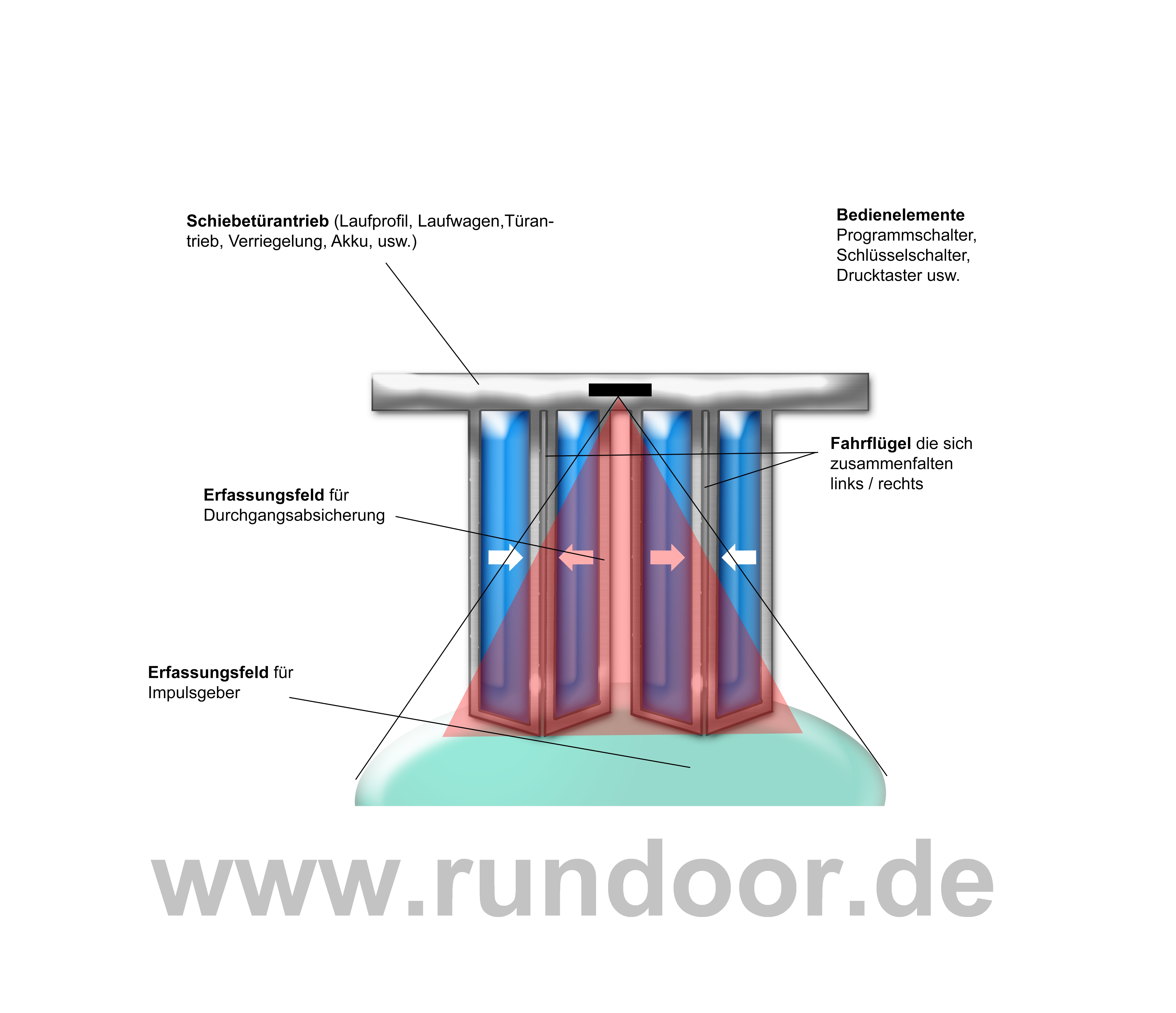 Automatische Faltflügeltüren kommen überall dort zum Einsatz, wo baulich bedingt die Montage einer standardmäßigen Schiebetür- anlage nicht möglich ist. Durch ihre besondere Bauweise ermöglicht die Faltflügeltür eine große Öffnungsweite bei geringen Einbaumaßen und seitlichem Platzbedarf.